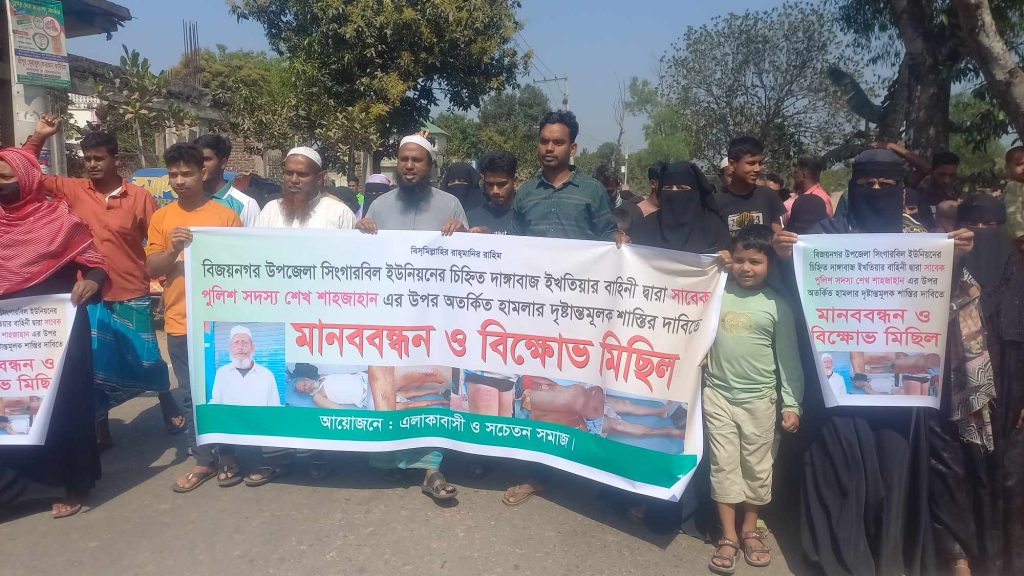 ব্রাহ্মণবাড়িয়া জেলার বিজয়নগর উপজেলার সিঙ্গারবিল ইউনিয়নের প্রবীন মুরব্বি শেখ শাহজাহানের (৭০) উপর সিঙ্গারবিল ইউনিয়ন বিএনপির সাংগঠনিক সম্পাদক ইখতিয়ার মুহরীর বাহিনীর অতর্কিত হামলার দৃষ্টান্তমূলক শাস্তির দাবিতে এই মানববন্ধন ও বিক্ষোভ মিছিল করেছে এলাকাবাসী।